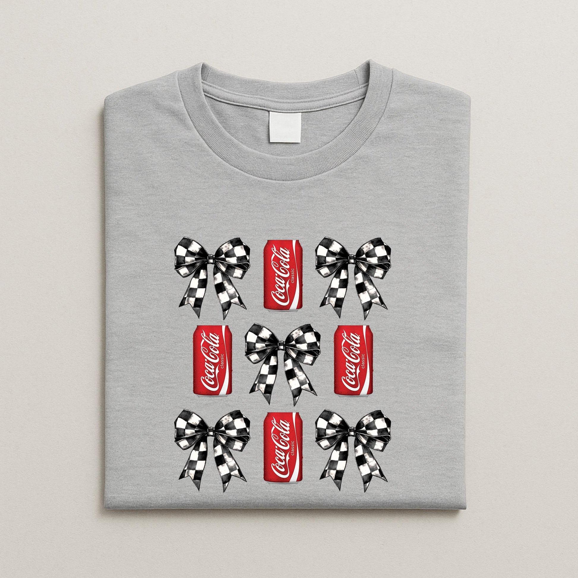 Instantly download this high-quality Coca-Cola & Checkered Bow PNG for your next project! Perfect for sublimation, DTF transfers, or creating your own t-shirts, tumblers, and more. This design features a bold Coca-Cola can pattern mixed with black-and-white checkered bows — ideal for retro and racing-inspired looks!
